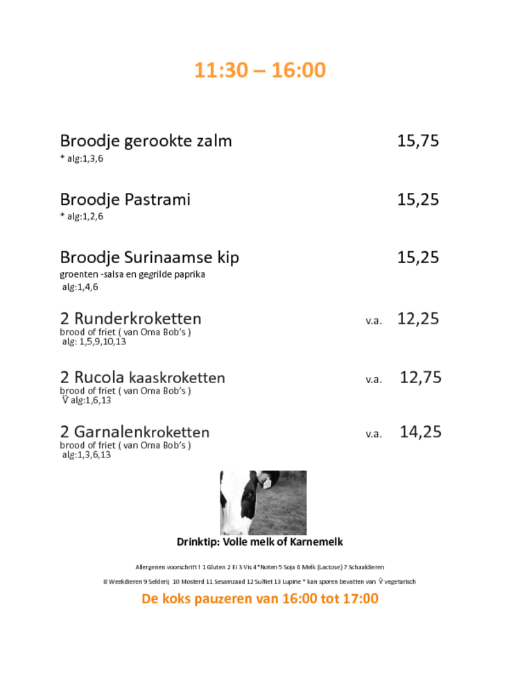 Onze lunchkaart, is een kaart die geheel aansluit op de wensen van de hedendaagse gast, met hier en daar een knipoog naar die goeie ouwe tijd. Ook hebben wij ons laten inspireren door onze jongere gasten. Zij gaven aan dat ze het broodje carpaccio misten, uiteraard hebben we deze toegevoegd maar dan wel van het beste vlees waardse rund. Wat te denken van de salade van gerookte zalm. Geitenkaas van boerderij Mooimekkerland. Een ouderwetse klassieker, kippenlever met spek ui en champignons. Natuurlijk hebben we gedacht aan de snelle zakenman met zijn heerlijke uitsmijters met bijv kaas uit de Krimpenerwaard van boerderij Schep en de heerlijke kroketten van Oma's Bob op brood of met friet. Ook serveren wij flamkúchen, deze is ook vegetarisch verkrijgbaar.